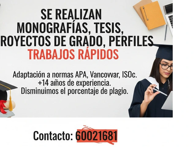 PERFIL, MONOGRAFÍAS, TESIS, PROYECTOS, NORMAS APA, VANCOUVER => Contáctanos a través de whatsapp: al 60021681 Tutoría, elaboración y corrección de trabajos de grado. Te ofrecemos: -MONOGRAFIAS -PROYECTOS -PERFILES -DIPLOMADOS -RESIDENCIA MEDICA -MAESTRIAS -TESIS DE GRADO -PLAN DE MARKETING -PLAN DE NEGOCIOS -NORMAS APA - VANCOUVER -ISO - HARVARD - MLA -SPSS - ESTADISTICA -COEFICIENTE DE CONFIABILIDAD -ENSAYOS Y RESUMENES -TODA CLASE DE INVESTIGACIÓN Con más de 12 años de experiencia en asesoramiento para Doctorados, Maestrías, Diplomados y Pre Grados. También ofrecemos: - Disminución de plagio en el documento - Informe de cantidad de plagio - Adaptación a formato APA, ISO, IEEE, VANCOUVE...
