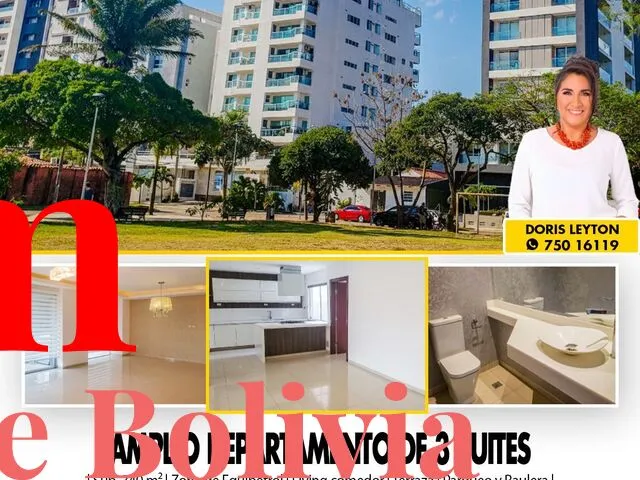 Edificio Condado – Inmediaciones Colegio Alemán Vive en la zona de Equipetrol, en un edificio exclusivo con lindas áreas comunes, seguridad y comodidad para su familia Cerca de los mejores hoteles, restaurantes del más alto nivel, universidades, supermercados, tiendas comerciales y mucho más. Superficie 340 mt2 Precio: $us. 2.500 c/expensas tc bs 7 Características: Tres dormitorios en suite (principal con dos vestidores) Sala de estar Living comedor Baño de visitas Amplias terrazas Galería cubierta con churrasquera Cocina comedor Lavandería Dependencia de servicio completa Patio de tendido de ropa Dos parqueos Una baulera Equipado con aires acondicionados, cortinas, empapelados, muebles emp...