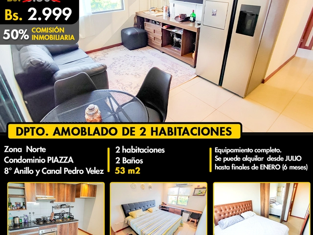 ???? ALQUILER AMOBLADO – DEPARTAMENTO 2 HAB. ????Zona Norte – Condominio PIAZZA ????️ 8° Anillo y Canal Pedro Vélez ???? Precio exclusivo por tiempo limitado: Bs. 3.500 ???? Bs. 2.999/mes Comisión Inmobiliaria 50% ???? ¡No pierdas esta oportunidad única! Departamentos como este no esperan, se alquilan en cuestión de horas. ✅ 53 m² funcionales y bien distribuidos ✅ 2 ????️ habitaciones ✅ 2 ???? baños ✅ Cocina equipada ✅ Sala-comedor con muebles de diseño ✅ Totalmente amoblado – solo llegas con tus maletas ???? Disponible desde JULIO hasta ENERO (6 meses) ???? Ideal para ejecutivos, parejas o estudiantes internacionales que valoran la comodidad, ubicación y ...