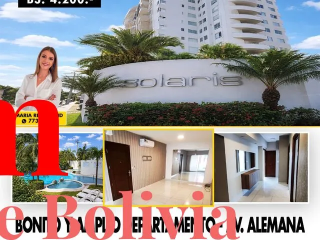 DEPARTAMENTO DE 2 DORMITOROS EN ALQUILER – CONDOMINIO SOLARIS Ubicación: Av. Alemana, entre 4to y 5to anillo, sobre avenida. Dimensión: 95 mt2 Precio: Bs. 4.200 (incluye expensas) DESCRIPCIÓN: - 2 dormitorios: uno en Suite (con aire acondicionado) - 1 baño compartido - Cocina amoblada - Lavandería. - Living comedor con aire acondicionado. - Balcón. - Se aceptan mascotas AREAS COMUNES: - Piscinas (adultos y niños). - Jacuzzi. - Churrasquera. - Sala de juegos. - Parque para niños. - Salón de fiestas. Para más información o coordinar visitas: Maria Rene David Asesor Inmobiliario - Capital Corporación Inmobiliaria Cel.: 773-87817