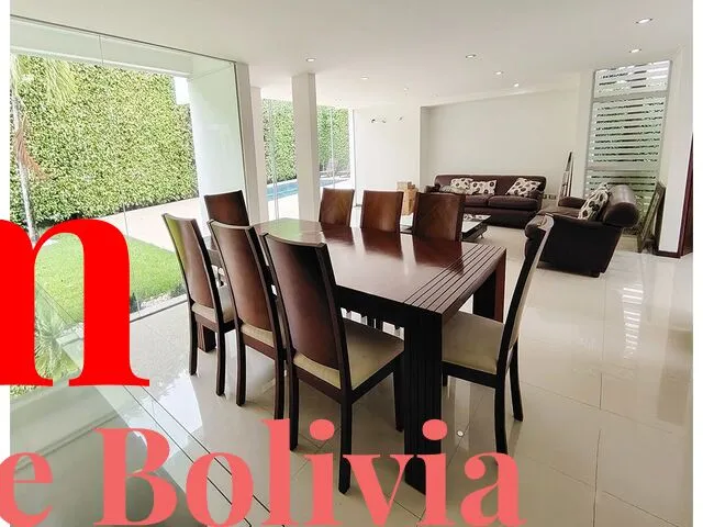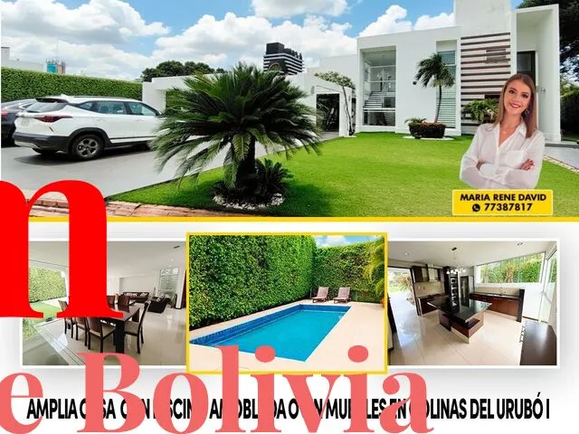 AMPLIA CASA AMOBLADA EN ALQUILER – COLINAS DEL URUBO I En condominio con seguridad 24 hrs, lindo entorno, amplia casa de dos plantas con piscina y amplio jardín, próximo al mall ventura, zona empresarial de Equipetrol, restaurantes, hoteles y mas… Superficie de terreno: 840 m2 Superficie construida: 343 m2 Precio: Bs 28.000 c/muebles, c/expensas y factura Precio: 25.000 s/muebles y factura Expensas: Bs. 910 DESCRIPCIÓN: Amoblada y equipada (no incluye televisores) PLANTA BAJA: - Hall ingreso - Escritorio - Cocina equipada y con isla - Living comedor - Baño de visitas ATRAS: - Jardín - Piscina - Churrasquera - Baño de piscina - Dependencia de servicio con baño - Lavandería - Deposito PL...