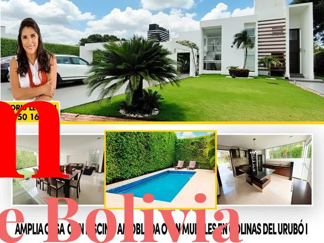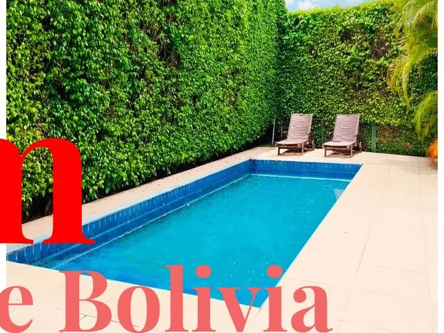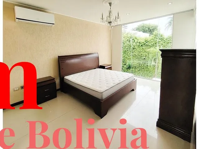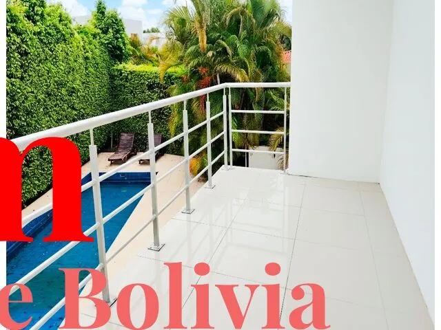 En condominio con seguridad 24 hrs, lindo entorno, amplia casa de dos plantas con piscina y amplio jardín, próximo al mall ventura, zona empresarial de Equipetrol, restaurantes, hoteles y mas… Superficie de terreno: 840 m2 Superficie construida: 343 m2 Precio: Bs 28.000 c/muebles, c/expensas y factura Precio: 25.000 s/muebles, c/expensas y factura Descripción: amoblada y equipada (no incluye televisores) Planta baja: Hall ingreso Escritorio Cocina equipada y con isla Living comedor Baño de visitas Atrás: Jardín Piscina Churrasquera Baño de piscina Dependencia de servicio con baño Lavandería Deposito Planta alta: Tres dormitorios en suite (uno con sala de estar) Suite principal con sal...