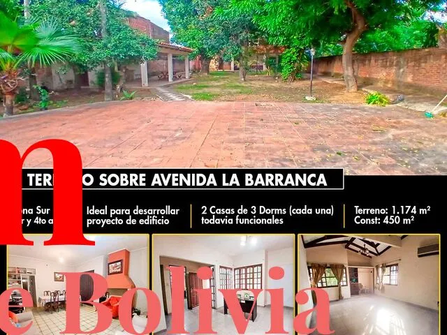 SOBRE LA AV. LA BARRANCA ENTRE 3ER Y 4TO ANILLO. PARA VIVIENDA , EMPRESAS O INVERSION INMOBILIARIA Zona Comercial Para todo tipo de proyecto inmobiliario ???? Superficie terreno : 1174 mts² ✅ Frente: 16 mt ✅ Fondo: 75 mt ????Construido 510 mts2 CONSTA DE: ???? Construcción habitable con 2 casas (Una adelante y otra atrás) Amplia churrasquera, patio, árboles frutales. ???? Papeles al día, sin deudas, listo para transferir. ???? Cerca de: Al colegio Juan Pablo II. Estadio Real Santa Cruz, Aeropuerto el trompillo Cine Center, Parque Urbano, Club Polanco. ???? Precio: $us 390.000 tc bs.7 (Negociable) ???? ???? ???? ???? ???? ???? ???? ???? ???? ???? ???? ✨????????‍???? Cel???? ...