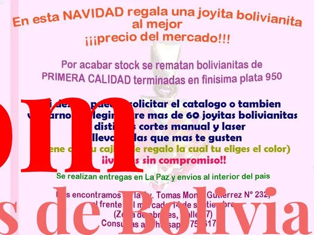 Puede solicitar el catálogo o también nos pueden visitar ¡¡¡sin compromiso!!! y elegir entre más de 60 joyas bolivianitas la que más le guste (Por joyita comprada se entrega una cajita de regalo, usted elige el color y modelo de la cajita)