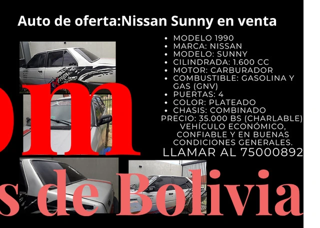 Modelo 1990 En venta auto :Marca: Nissan Modelo: Sunny Cilindrada: 1.600 cc Motor: Carburador Combustible: Gasolina y Gas (GNV) Puertas: 4 Color: Plateado Chasis: Combinado Precio: 35.000 Bs (charlable). Vehículo económico, confiable y en buenas condiciones generales. Llamar al 75000892