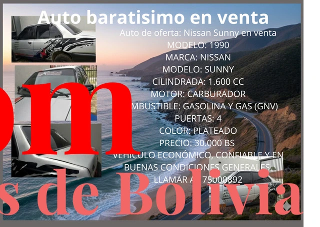 Auto de oferta: Nissan Sunny en venta MODELO: 1990 MARCA: NISSAN MODELO: SUNNY CILINDRADA: 1.600 CC MOTOR: CARBURADOR COMBUSTIBLE: GASOLINA Y GAS (GNV) PUERTAS: 4 COLOR: PLATEADO PRECIO: 30.000 BS VEHÍCULO ECONÓMICO, CONFIABLE Y EN BUENAS CONDICIONES GENERALES. LLAMAR AL 75000892